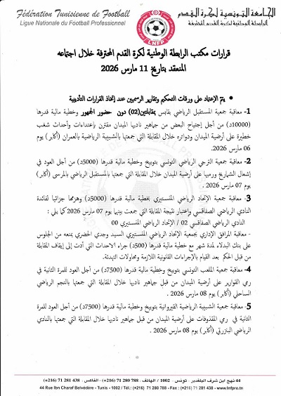 قرّر مكتب الرابطة الوطنية لكرة القدم المحترفة هزم الاتحاد المنستيري جزائياً أمام النادي الصفاقسي بنتيجة هدفين مقابل صفر وذلك على خلفية الأحداث التي رافقت المباراة.