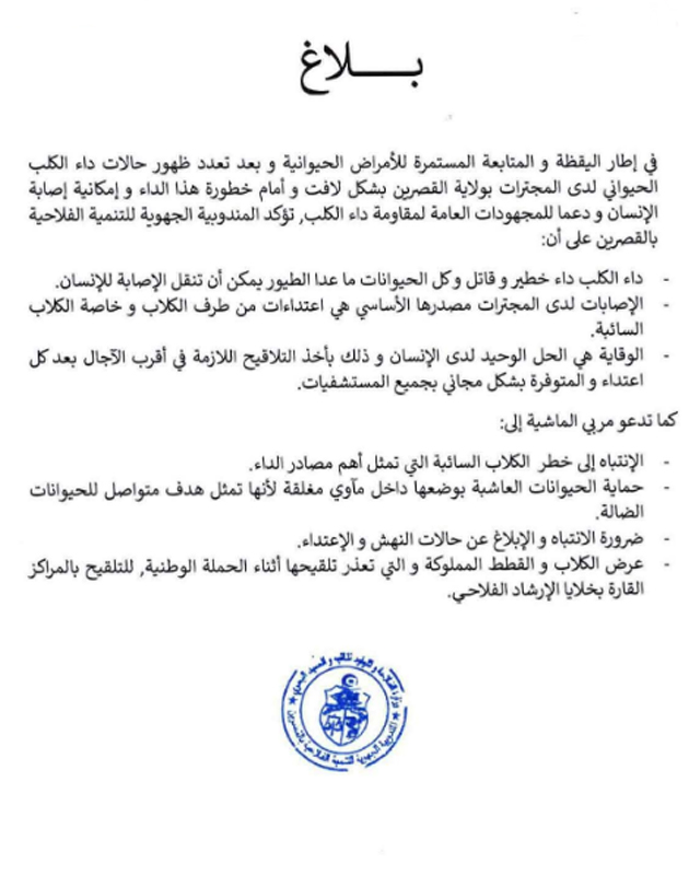 أعلنت المندوبية الجهوية للتنمية الفلاحية بالقصرين عن حالة من الاستنفار في صفوف مصالحها، وذلك إثر تسجيل تصاعد ملحوظ في إصابات داء الكلب لدى الحيوانات المجترة بالولاية.