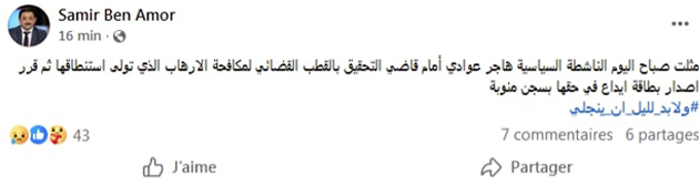 يذكر أنه قد تم إيقاف هاجر عوادي بسبب نشرها لتدوينات تمجّد الإرهاب.
