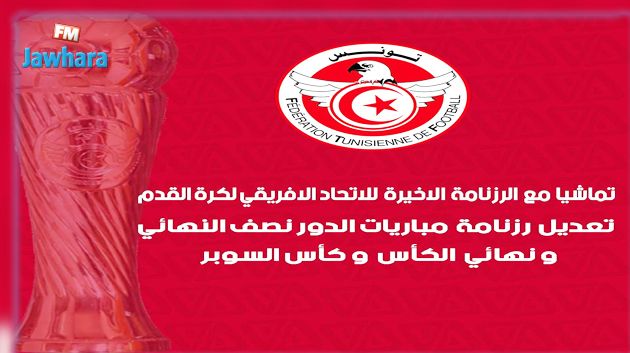 أعلنت الجامعة التونسية لكرة القدم اليوم ، انه و تماشيا مع الرزنامة الاخيرة للاتحاد الافريقي لكرة القدم تقرر تعديل رزنامة مباريات الدور نصف النهائي ونهائي الكأس وكأس السوبر لتصبح كالتالي: