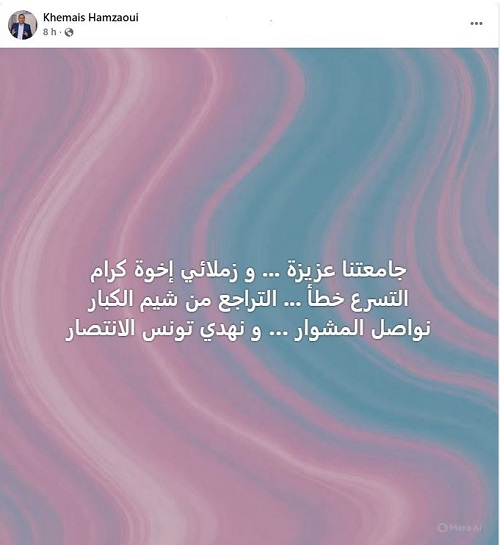 أعلن خميس الحمزاوي، عضو المكتب الجامعي تراجعه عن استقالته من الجامعة التونسية لكرة القدم وذلك عبر تدوينة نشرها على حسابه الشخصي على الفايسبوك.