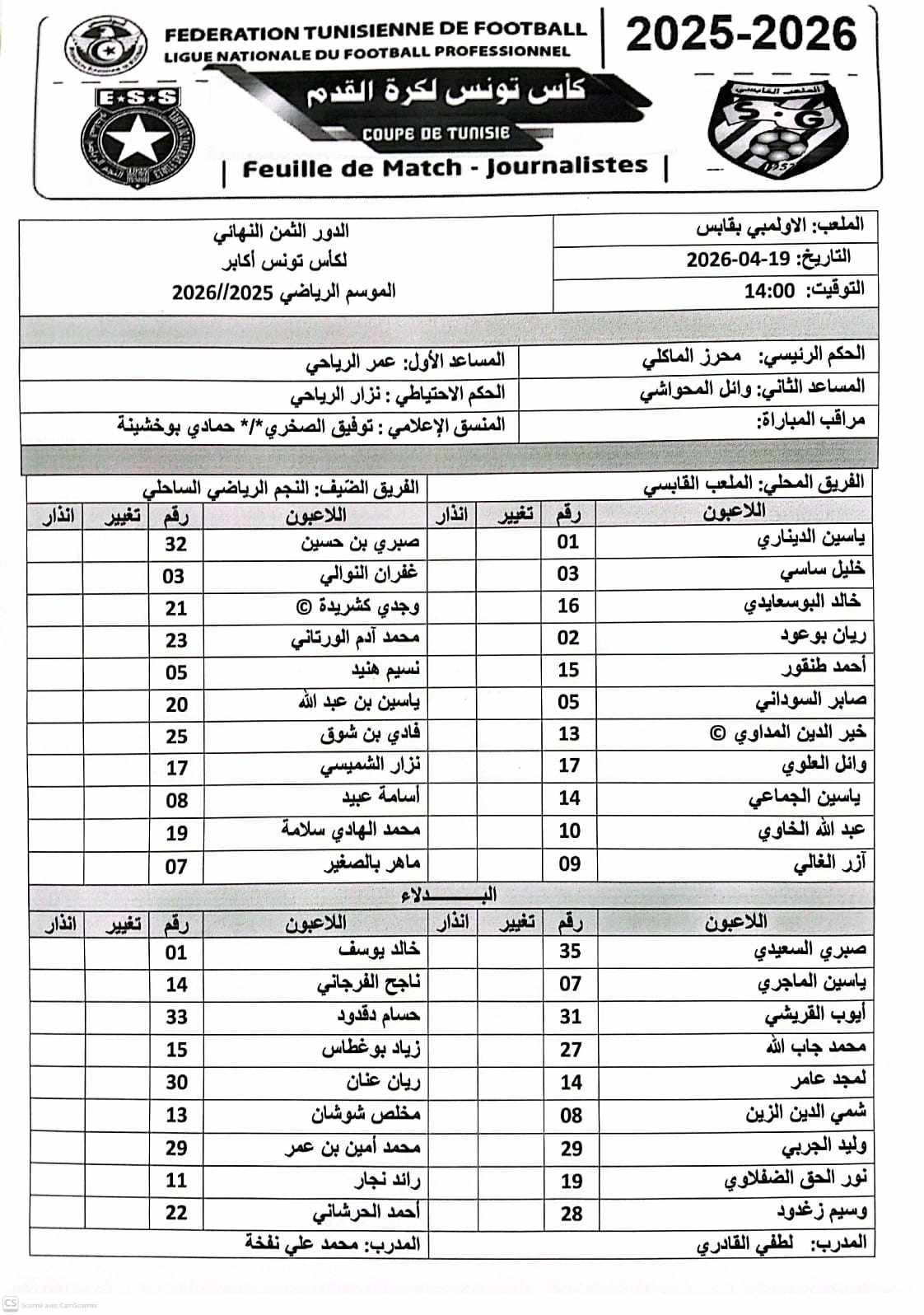 يواجه الملعب القابسي اليوم ضيفه النجم الساحلي بداية من الساعة 14:00 في اطار الدور ثمن النهائي لكأس تونس, و في ما يلي التشكيلة الأساسية للفريقين: