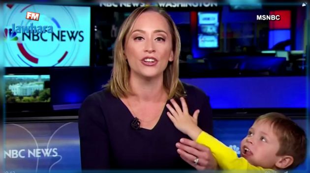 لكن المراسلة استسلمت وقاطعت النشرة مخاطبة المشاهدين بالقول: " اعذروني، ابني هنا."