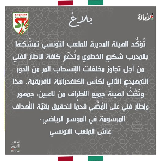 أكدت هيئة الملعب التونسي في بلاغ لها تمسكها بالمدرب شكري الخطوي وتُدّعم كافة الإطار الفني من أجل تجاوز مخلفات الإنسحاب من الدور التمهيدي الثاني من مسابقة كأس الكاف.