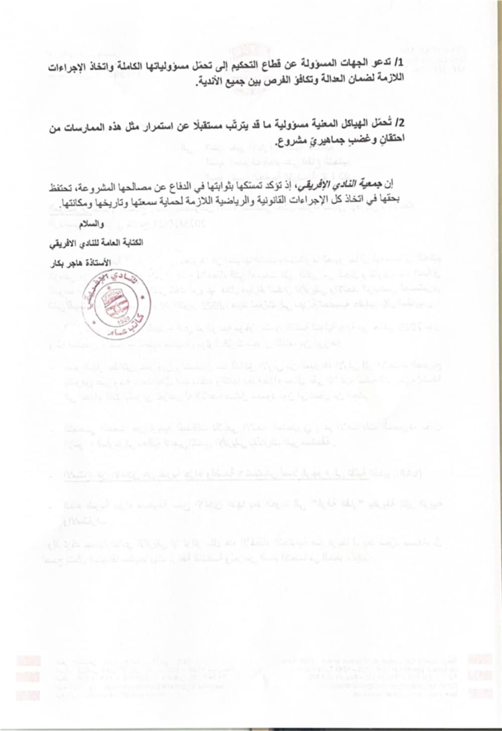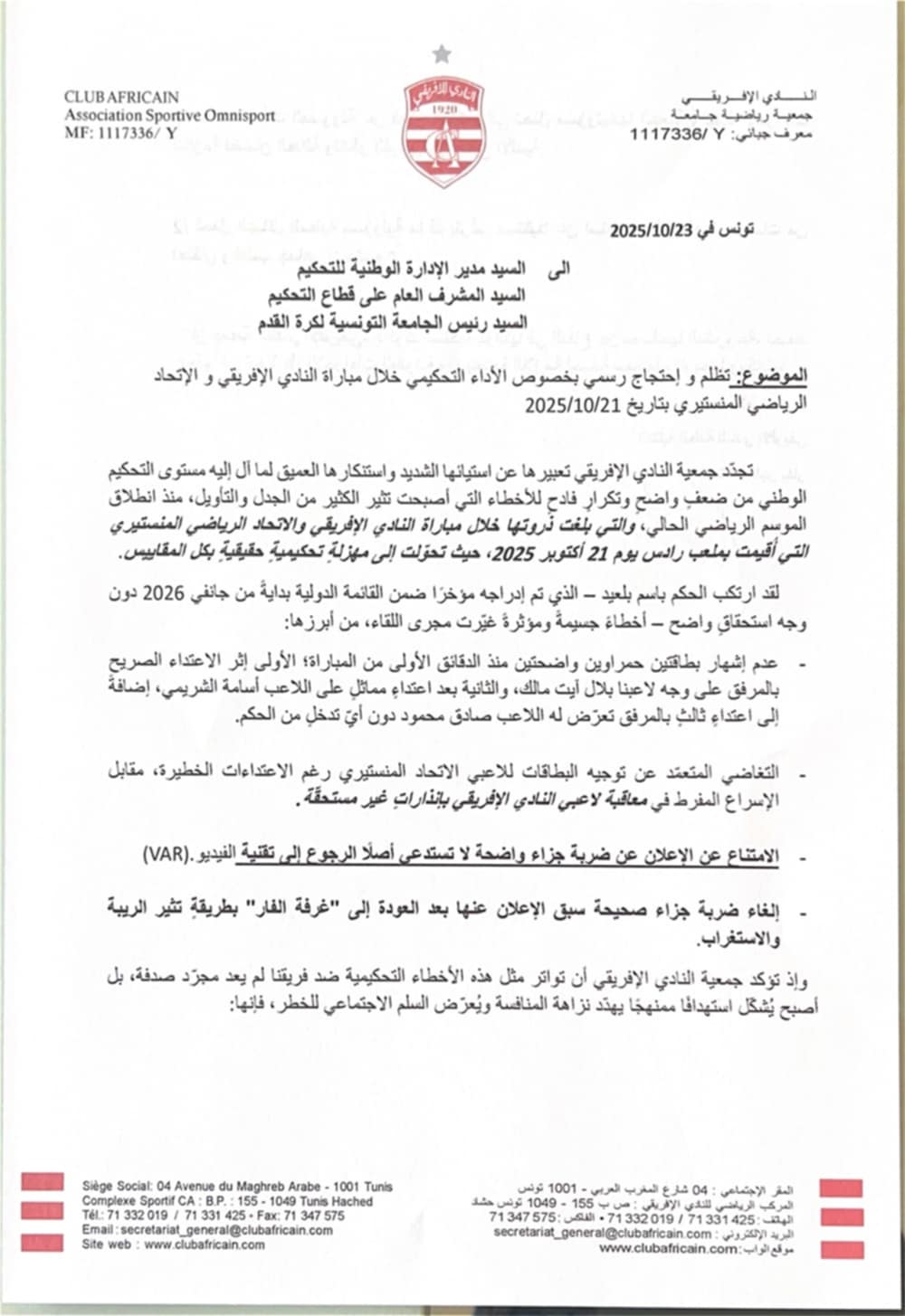 وجّهت إدارة النادي الإفريقي مراسلة رسمية إلى الإدارة الوطنية للتحكيم، عبّرت فيها عن احتجاجها على الأداء التحكيمي للحكم باسم بلعيد خلال مباراة الفريق أمام الاتحاد المنستيري، التي جرت يوم الثلاثاء الماضي وانتهت بفوز النادي الإفريقي بنتيجة هدفين مقابل هدف.
