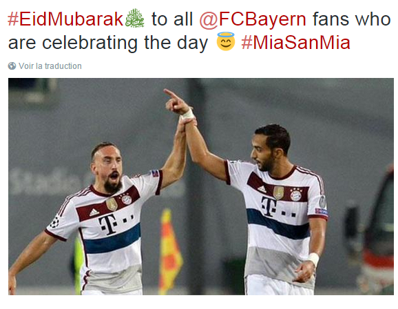 اكد بيارن ميونيخ عبر موقعه الرسمي على توتير احترامه للمسلمين فبعد اعتذاره سابقا عن نشره لصور لاعبيه وهم يشربون الماء اثناء الحصة التدريبية في شهر رمضان قام النادي البافاري اليوم الخميس 16جويلية 2015 بتهنئة الامة الاسلامية بعيد الفطر المبارك.