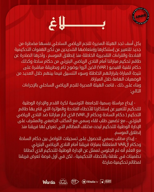 أصدر النجم الرياضي الساحلي، اليوم، بلاغًا رسميًا أعرب فيه عن استنكاره الشديد وإمتعاضه من تكرار الهفوات التحكيمية الفادحة منذ بداية الموسم، وآخرها ما سجّل خلال مباراته ضد النادي الرياضي البنزرتي.