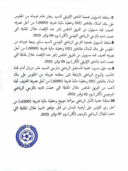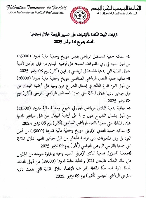أصدرت الهيئة المكلفة بالإشراف على تسيير الرابطة الوطنية لكرة القدم المحترفة جملة من القرارات التأديبية في حق عدد من الأندية: