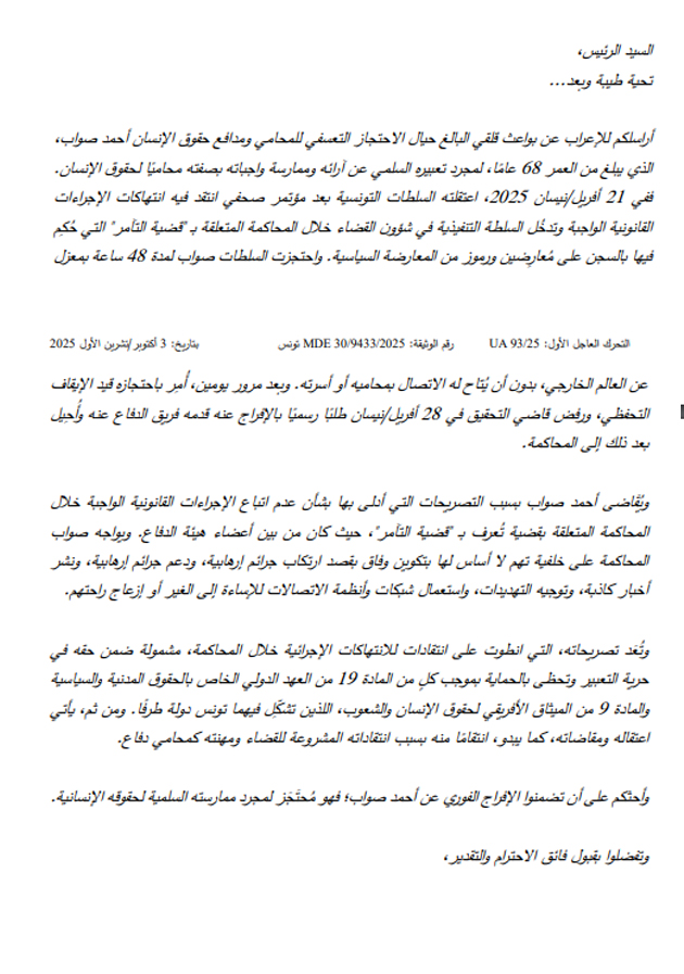 وقالت في بيان لها، إن صواب "يُحتَجَز تعسفًا منذ 21 أفريل 2025، بسبب عمله في مجال الدفاع عن ضحايا انتهاكات حقوق الإنسان وممارسته المشروعة لحقه في حرية التعبير، وإنه ويواجه حاليًا المحاكمة على خلفية تهم متعلقة بالإرهاب لا أساس لها بسبب مجرد تصريحات انتقد فيها عدم اتباع الإجراءات القانونية الواجبة وانتهاكات الحقوق في المحاكمة العادلة خلال المحاكمة المتعلقة بـ “قضية التآمر”، والتي كان يُمثِّل فيها عدة متهمين".