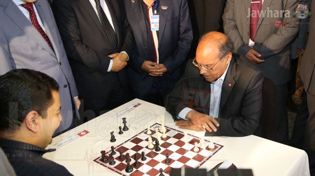 المنصف المرزوقي يشارك في مباريات شطرنج لدى إشرافه على افتتاح الدورة الدولية الأولى لمهرجان المرحوم رضا بلقاضي للشطرنج بالمنستير